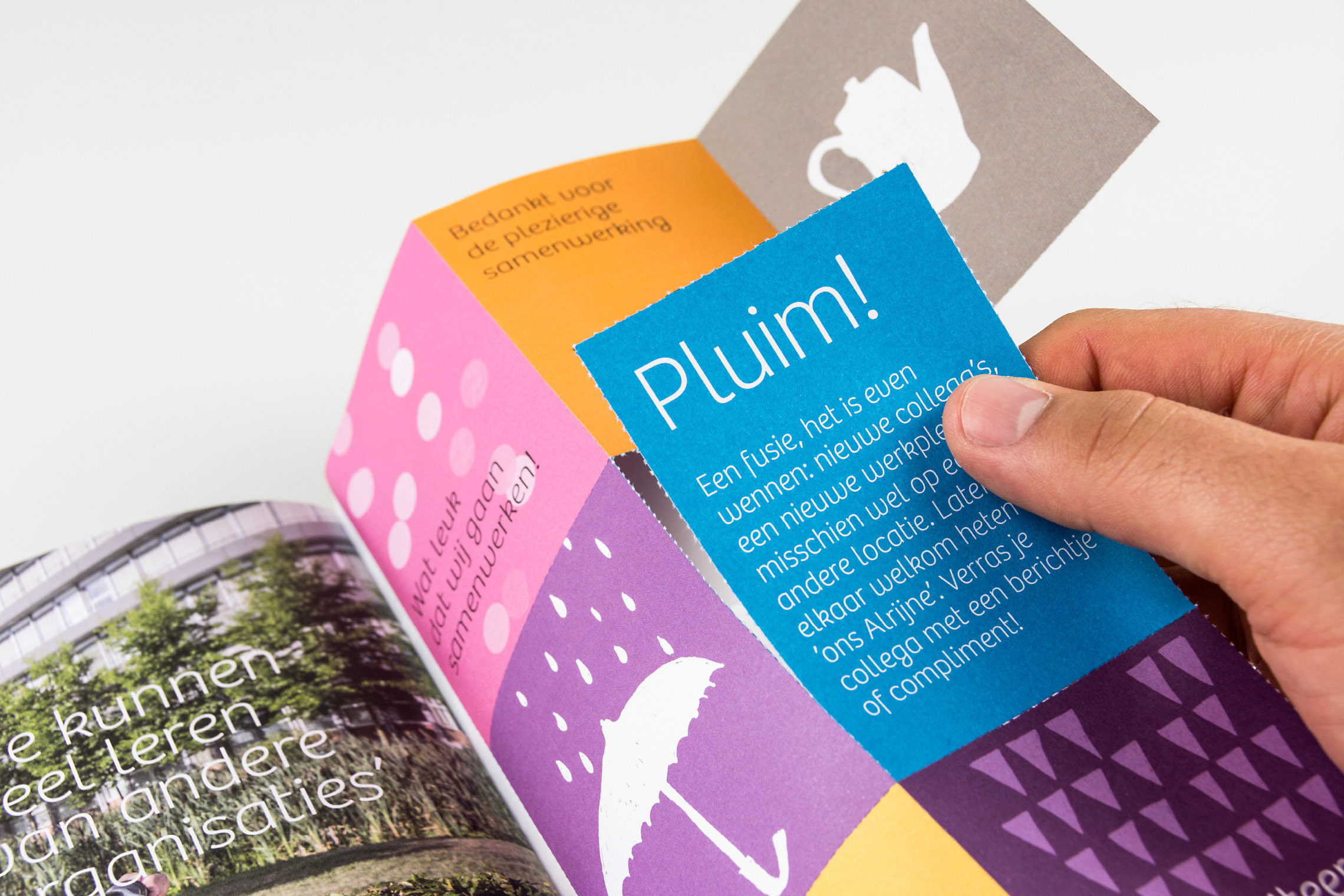 Deze overtuiging vertaalden we naar een vorm waarmee Alrijne zich onderscheidt van haar veelal institutioneel ogende concurrenten. Het handgetekende logo verbeeldt de persoonlijke aandacht, de signatuur die de medewerkers typeert bij het uitvoeren van hun werk. Samen beslissen komt tot uiting in de overlappende vlakken met warme kleuren. De combinatie leidt tot een vriendelijke en toch strakke vormtaal die veelzijdig en praktisch toe te passen is. Zo kan Alrijne zelf continu nieuwe uitingen ontwikkelen.