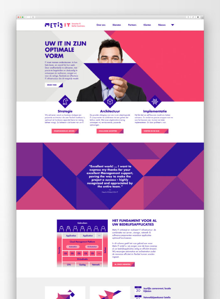Het werk van de Metis IT’ers is voor veel mensen onzichtbaar, maar hun inbreng gaat niet ongemerkt aan hun opdrachtgevers voorbij. Wij plaatste de overtuigende testimonials prominent op de site.