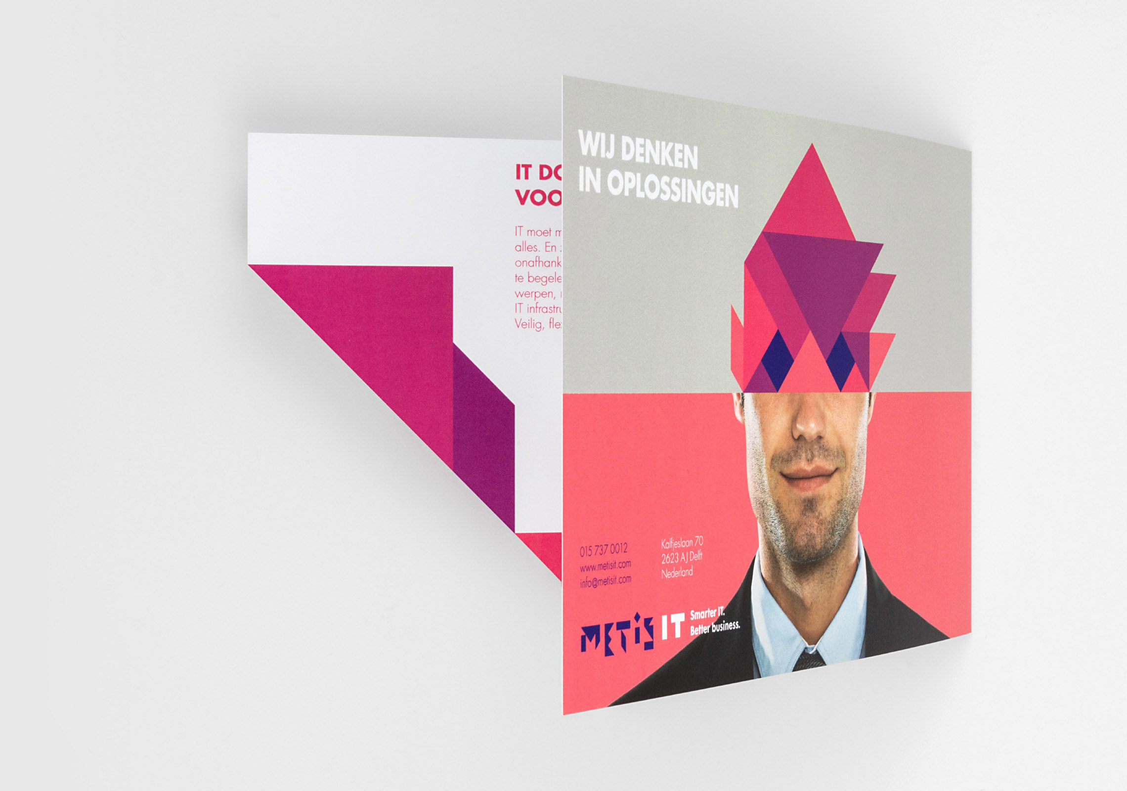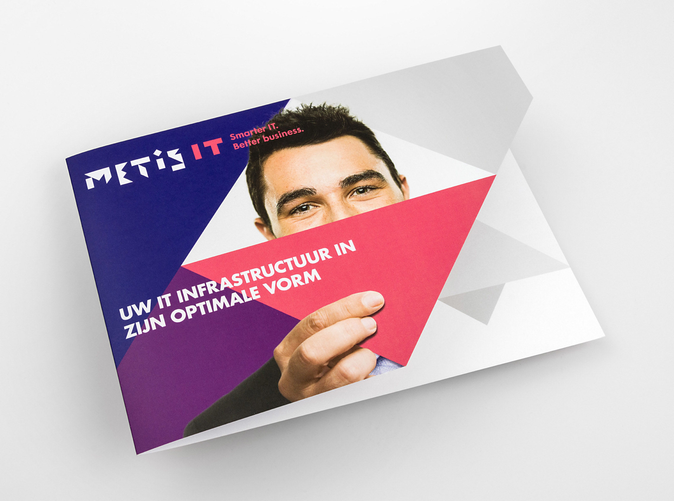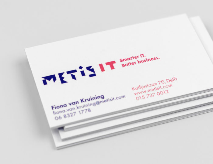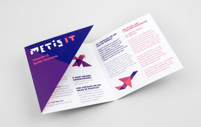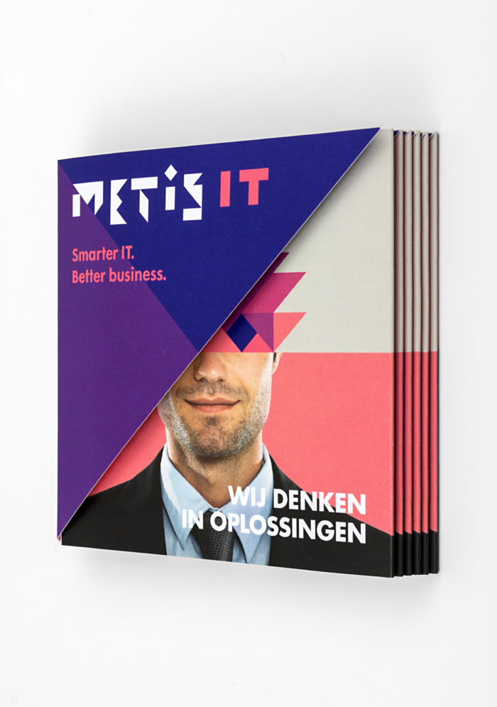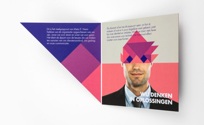 Het verhaal van Metis IT is voor medewerkers vastgelegd in het merkpaspoort. De gestansde voorzijde en volledig geometrisch opgebouwde vormtaal maken de branding compleet.