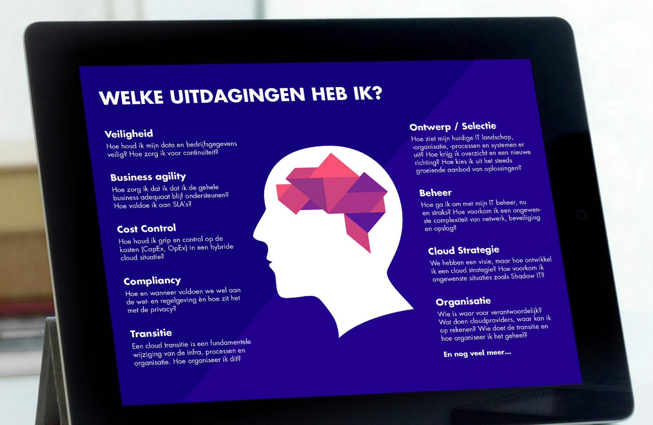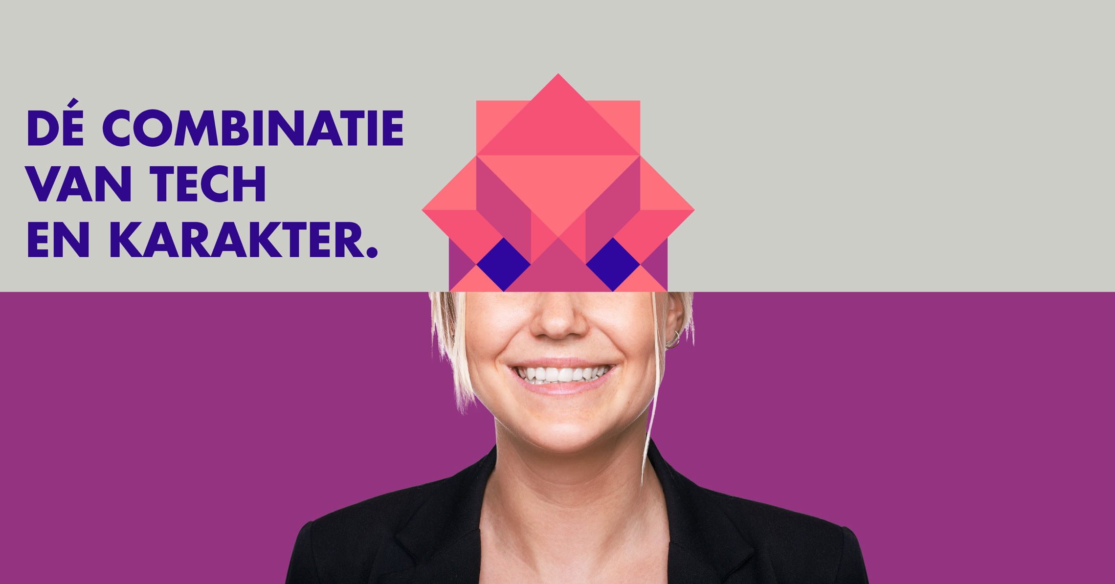 Dit concept leidde tot een krachtig logo: een woordmerk opgebouwd uit basisvormen. Hieruit vloeit een rijke vormtaal, die herkenbaar en tegelijk flexibel is. Om het compleet te maken ontwikkelden we als campagnebeeld het “tangramhoofd”: de medewerker die IT leeft en ademt. Zo verbinden we de mensen en het IT vraagstuk. En wat blijkt: medewerkers, relaties en sollicitanten, allemaal willen ze IT in zijn optimale vorm.