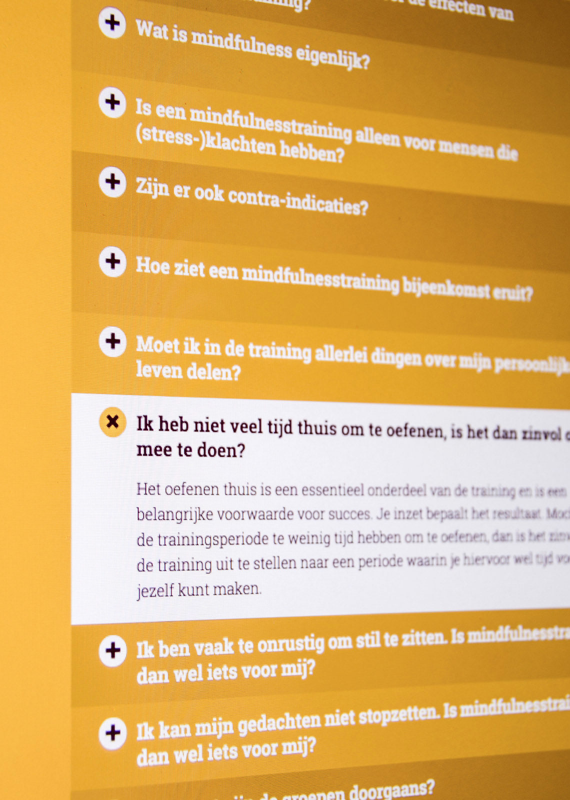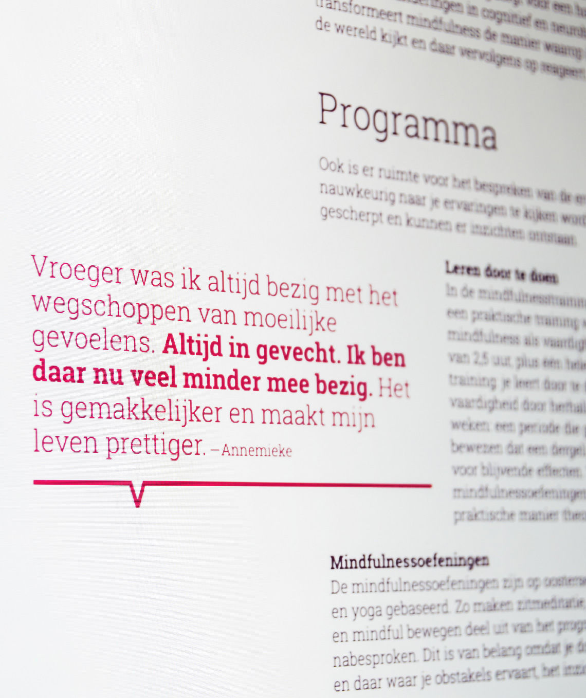 Mindfulness wordt vaak geassocieerd met zweverige natuurfoto’s en de lotushouding in een boomhut. De uitdaging voor ons was om de professionaliteit van het centrum te tonen zonder koud en afstandelijk te worden. Een stijl die zowel zakelijk als persoonlijk aanspreekt. We vonden de balans in zakelijke typografie op warme kleuren gecombineerd met illustraties. In de verbeelding van alledaagse handelingen, voel je hoe we onze aandacht kunnen richten.