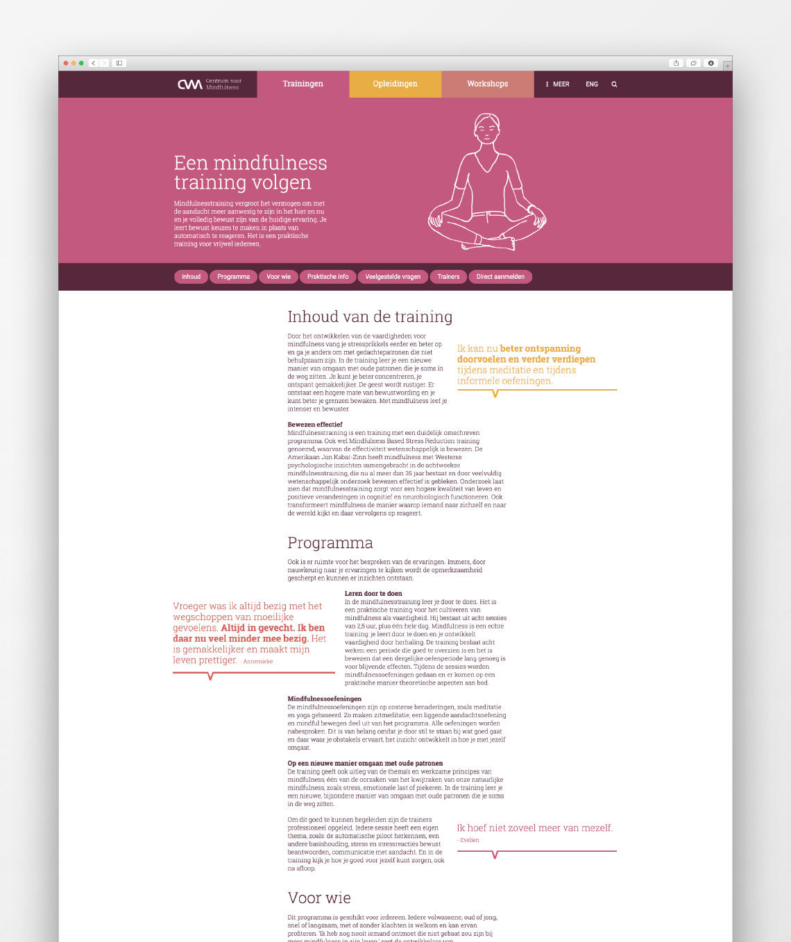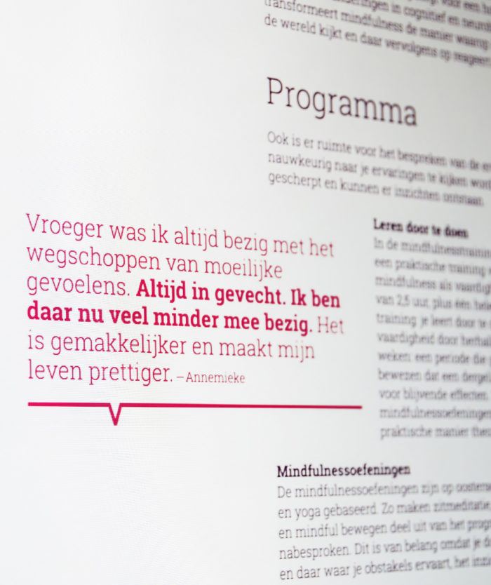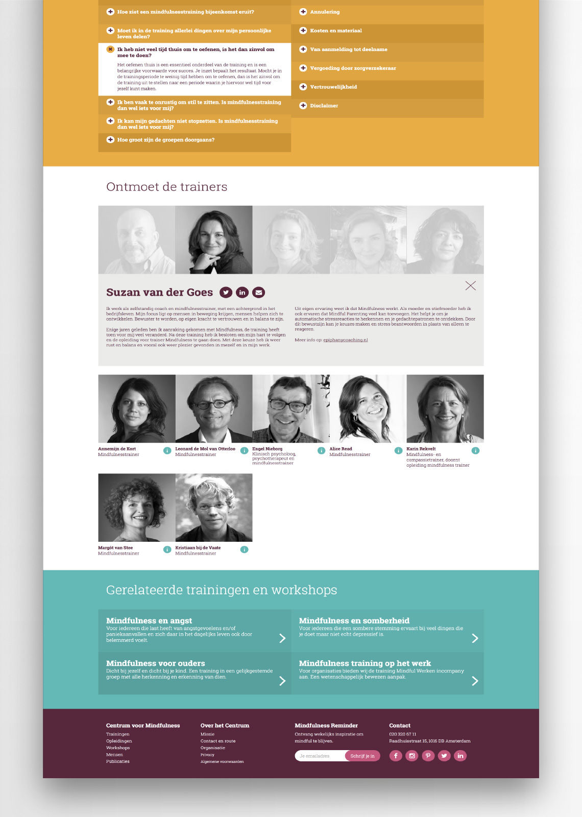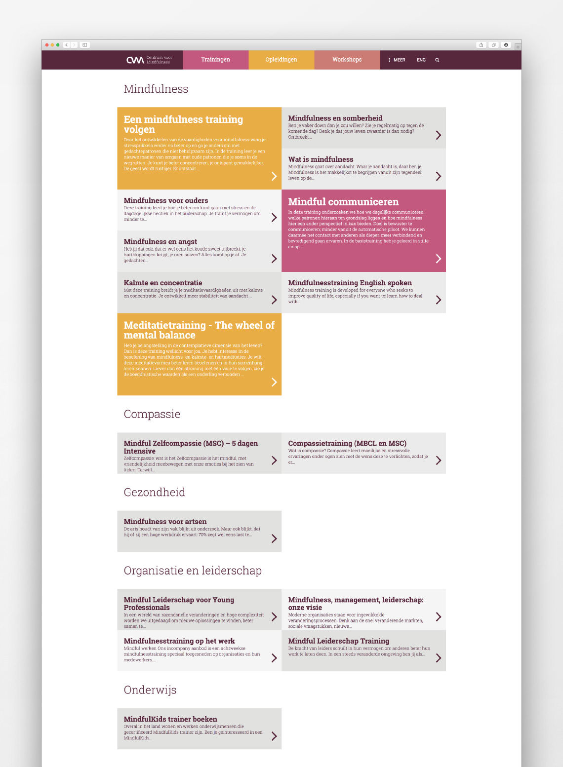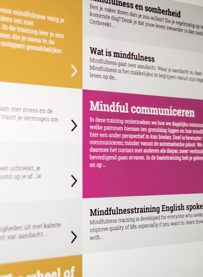 Het Centrum voor Mindfulness benaderde ons voor een redesign van hun website, maar we werden het er snel over eens waren dat hun hele merk een flinke opfrisbeurt kon gebruiken. En hoe verbeeld je dan de rust die hoort bij mindfulness en de autoriteit die past bij het Centrum?