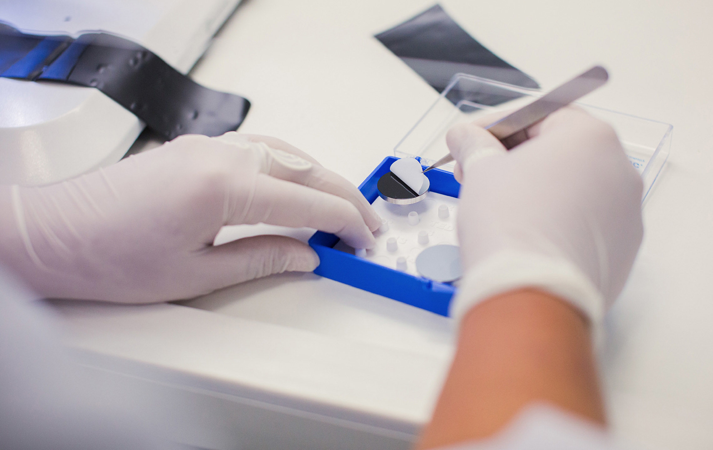 In het lab worden dagelijks dit soort monsters onder de microscoop bekeken. We tonen het in de identiteit in combinatie met beeld van de analisten.
