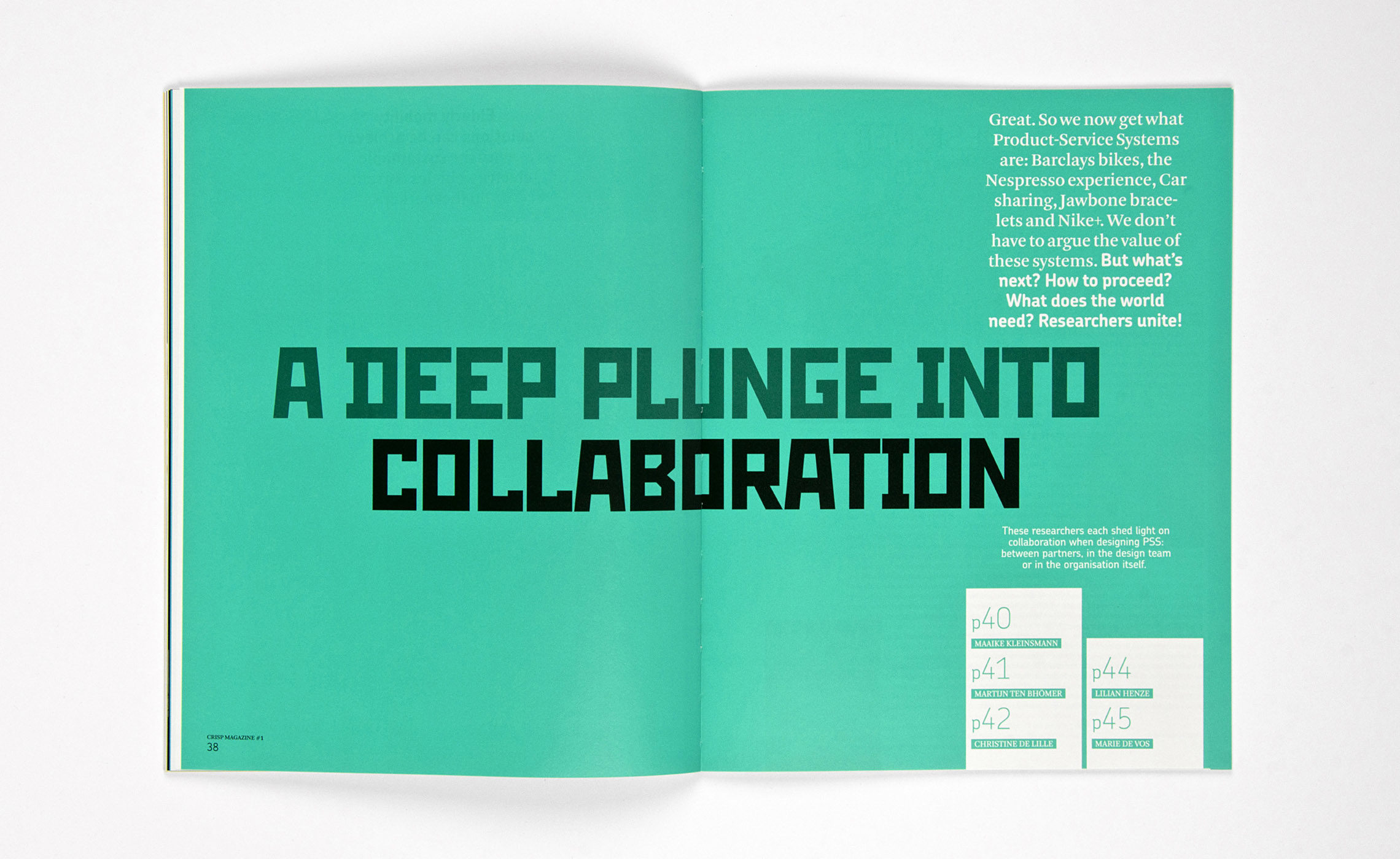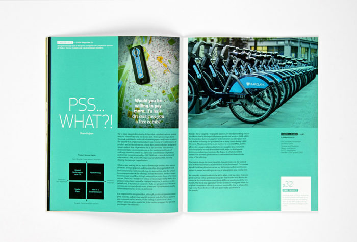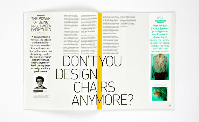 Producten worden complexer, en bestaan vaak zelfs enkel als software interface of dienst. Zo rijst een prikkelende — en confronterende — vraag: “Don’t you design chairs anymore?”. Wij kozen dit citaat uit een van de artikelen voor de cover, omdat het zo goed de paradox van het ontwerpen van Product Service Systems vangt: ontwerpers bedenken geen eenvoudige, op zichzelf staande objecten meer, maar werken aan een klein deel dat onderdeel is van een verbonden samenleving.