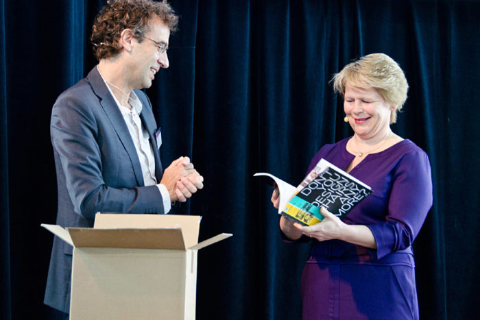 Het eerste exemplaar wordt overhandigd aan Marjan Hammersma, Directeur generaal van het Ministerie Onderwijs, Cultuur & Wetenschap.