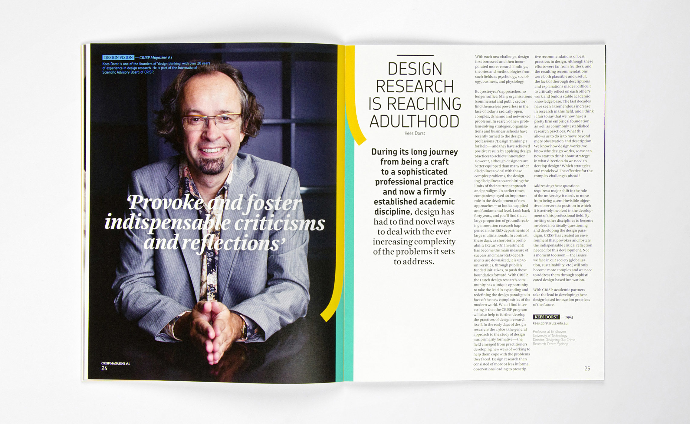 CRISP Platform is een samenwerking tussen onderzoekers en ontwerpers van creatieve bedrijven, onderwijsinstellingen en industriële partners. In acht innovatieve projecten wordt het blikveld op het ontwerpen voor Product Service Systems verruimd. Ontwerpers leren de waarde van onderzoek en hoe het toe te passen. Onderzoekers krijgen inzicht in de ontwerppraktijk en hoe hun onderzoek in kan spelen op de doelstellingen van de industrie. CRISP is hét voorbeeld hoe wetenschappers, ontwerpbureaus en de industrie samen kunnen innoveren.
