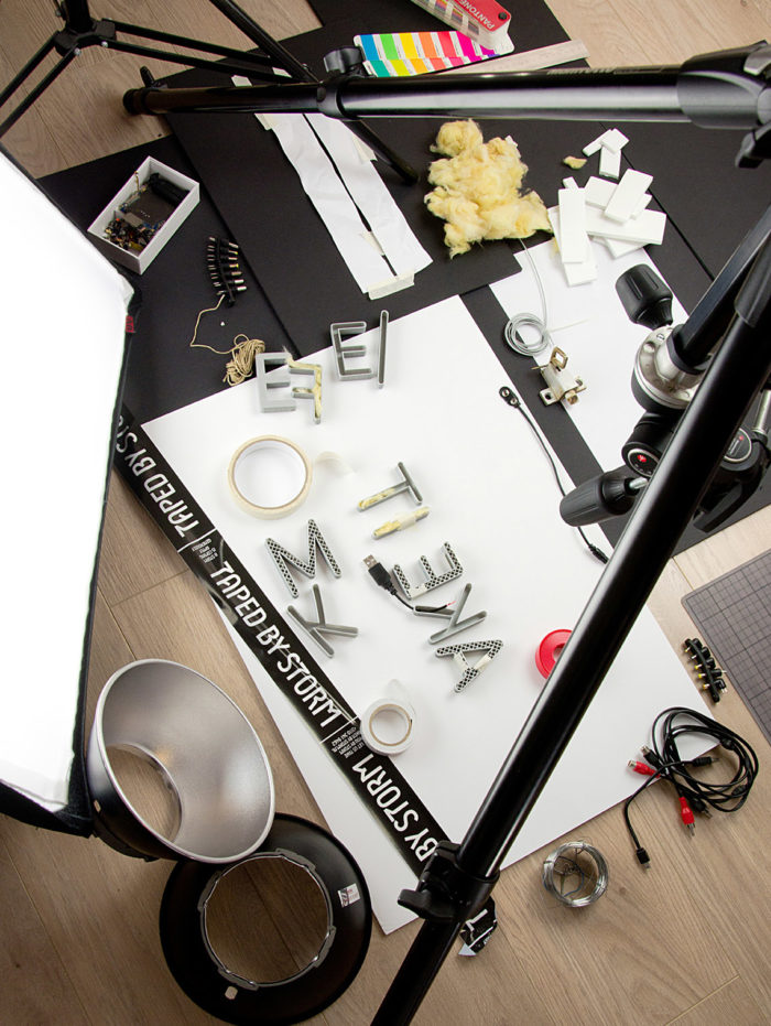 Modellen en prototypes kun je nauwelijks beter illustreren dan door de 3D printer aan het werk te zetten en fysiek letters te gaan bouwen — tot en met ingebouwde verlichting.
